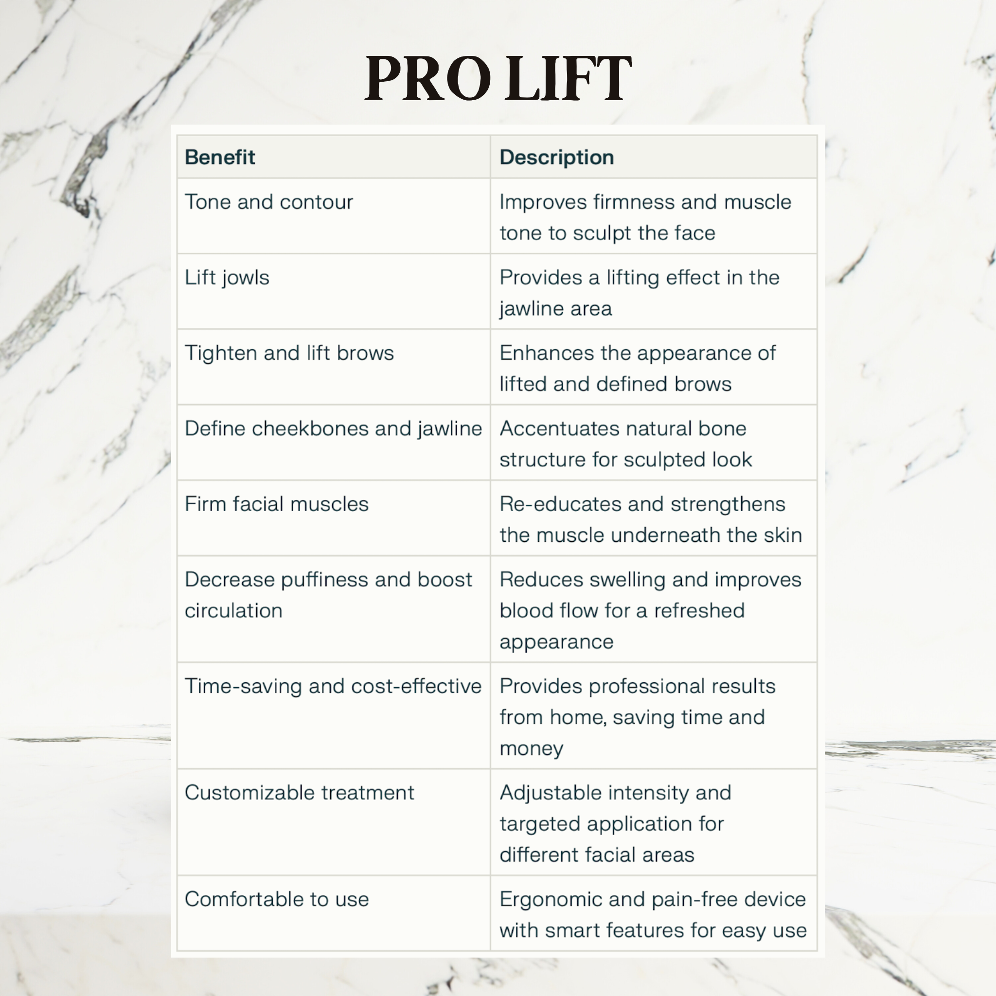 By improving muscle tone, definition, and contour, the Pro Lift delivers a lifted, youthful appearance from the very first sessions.